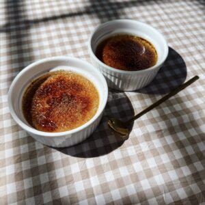 - Caramelize: Just before serving, sprinkle 1 tsp sugar over each custard. Use a kitchen torch (or broil briefly) until the top is golden and crisp. Dust lightly with pumpkin pie spice.